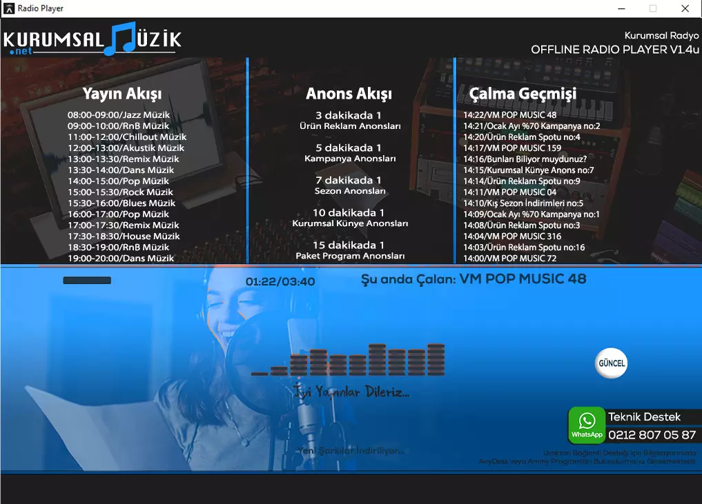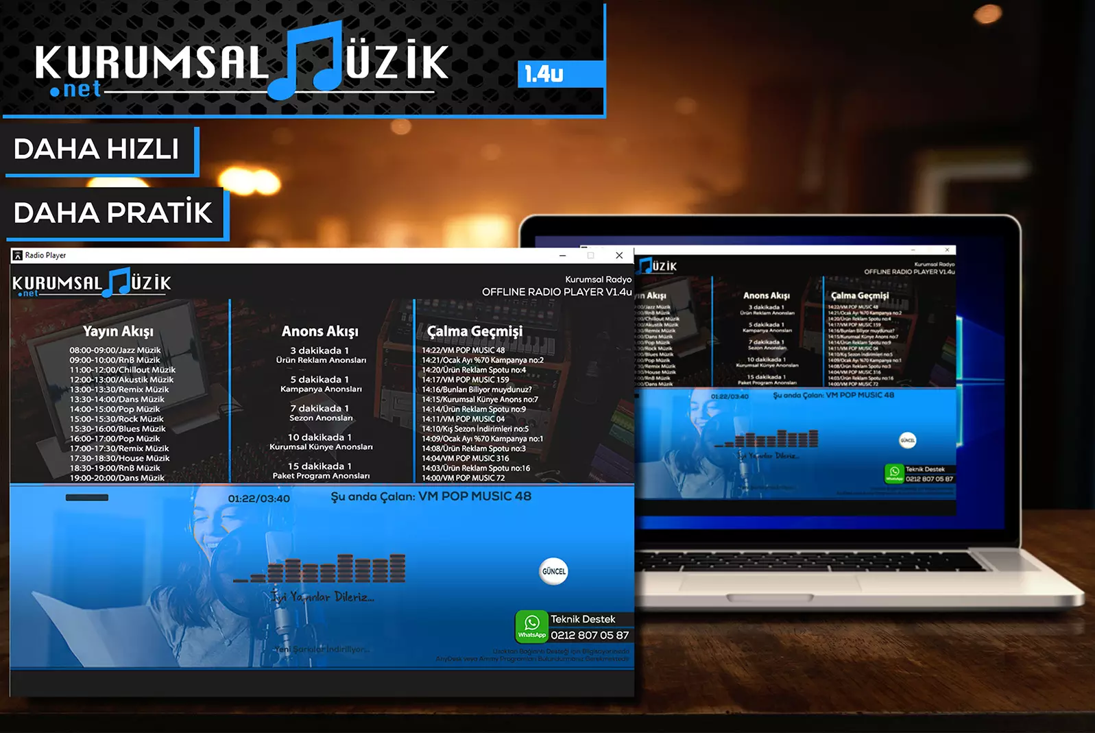 Kurumsal Müzik Net Radio Player, internet bağlantısı gerektirmeden yayın yapabilen JAVA tabanlı bir programdır. Yazılımın stabilitesi ve basit kurulumu, diğer radyo otomasyon yazılımlarından farklı kılar. Program tamamen Mağaza Radyoculuğu için tasarlanmıştır ve Windows XP, Server, 7, 8, 10 ve 11 işletim sistemlerinde sorunsuz çalışır.
